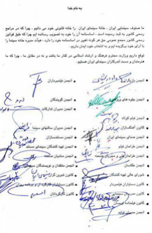 در ذیل این نامه امضای روسای صنوف انجمنهای بازیگران، جلوههای ویژه، فیلم کوتاه، آهنگسازان، صدای سینمای ایران، طراحان فیلم، طراحان فنی و مجریان صحنه، عکاسان، شورای عالی تهیه کنندگان، کانون دستیاران فیلمبردار، کانون مدرسان سینمایی، کانون فیلم نامه نویسان، انجمن مدیران تولید، انجمن فیلمبرداران، انجمن گویندگان، مدیران تدارکات، مدیران سالنهای سینما، مستند سازان، تهیه کنندگان سینمای مستند، منشیان صحنه، منتقدان و نویسندگان سینمایی، کانون تدوین گران سینمای ایران، کانون دستیاران کارگران و برنامه ریزان و کانون کارگردانان دیده میشود.